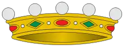 The heraldic coronet of a nobile consists of a jewelled circlet of gold surmounted by five pearls, either on stems or set directly upon the rim. The armorial shield of a nobile is surmounted by a silver helm displayed in a ¾ side-view and surmounted by the coronet already described. It is typically displayed above the shield in the full heraldic achievement associated with a noble's specific title.