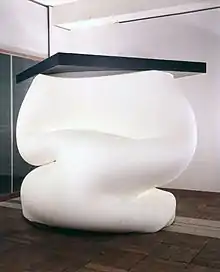 Phase—Sponge (1968) (位相:スポンジ) was a white cylinder of sponge, distorted under the weight of a black sheet of iron laid on top of it. One can understand from this work that structure remains the same even if there are changes in form, and that what is deformed can be restored to its original shape. Writing about this work, Lee Ufan suggested that “perhaps all primitive people had to do was to stack up rocks like dolmens. However, in today’s industrial society, an iron plate on a sponge cylinder more naturally elicits a response”.[22]