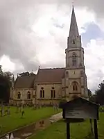 Within the village there is a Church of England Church, *All Saints,.[68] All Saints Anglican parish church is Grade II* listed.[69] It was built in 1862 by George Gilbert Scott, and according to Pevsner is a "typical estate church" and "one of Scott's major works". It is of Early English style in Ancaster stone, with a 130 feet (40 m) steeple. On the walls are drawn religious scenes outlined in red. There are stained glass windows by Clayton and Bell. Monuments are to Sir William Ellys (died 1680), attributed to William Stanton, to the Fourth Earl of Buckinghamshire (died 1816), to Rev. Henry Hobart, Dean of Windsor (died 1846), and to the First Earl of Ripon (died 1859), this designed by George Gilbert Scott with an 1862 effigy by Matthew Noble.[70] All Saints was built on the site of a previous St Peter's church built by the Third Earl of Buckinghamshire in 1775, who destroyed an original St Peter's Church because it was "too near the Hall". The monument to Sir William Ellys is from the original church.[71] Cox describes the 1775 church as having been "a mean affair".[71][72]