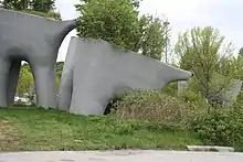 In 2013 he installed the public sculpture Dawes Crossing at the intersection of Dawes Road and Victoria Park Avenue in Toronto, Ontario. The piece integrates the outline of a traditional barn with a solar wand wind-powered system that irrigates a small garden beneath the barn.[43] The sculpture was negatively received by some local residents, who were confused as to what the purpose of the structure was.[44][45]