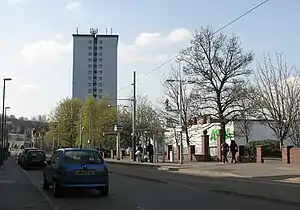 Noel Street is a tram stop on Nottingham Express Transit (NET), in the city of Nottingham suburb of Hyson Green. The tram stop opened on 9 March 2004, along with NET's initial system. It is located on a one way section of the tramway, and is served only by northbound trams; the nearest southbound stop is the Hyson Green Market tram stop. The tram stop is located on a contra-flow reserved track alongside Noel Street, which is at this point one way southbound, and has a single side platform flanking the single track.[1][2]
