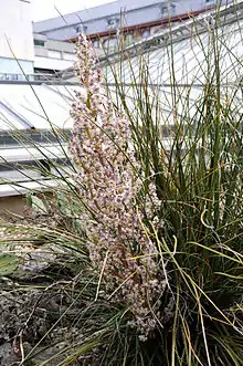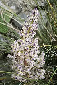 Nolina greenei grows in rocky locations such as limestone outcrops and old lava flows, often in grasslands or in pine-oak woodlands at elevations of 1200–2000 m. It is a perennial rosette forming plant with an underground caudex. Leaves are long and narrow, sometimes over 100 cm long but rarely more than 1 cm wide. They sometimes have sharp teeth along the margins. Flowering stalk is up to 20 cm high, with a large panicle of white flowers with purple midveins. Fruit is a dry, inflated capsule up to 5 mm across.[2][4]
