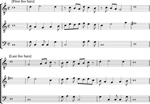 Retrograde was not mentioned in theoretical treatises prior to 1500.[2] Nicola Vicentino (1555) discussed the difficulty in finding canonic imitation: "At times, the fugue or canon cannot be discovered through the systems mentioned above, either because of the impediment of rests, or because one part is going up while another is going down, or because one part starts at the beginning and the other at the end. In such cases a student can begin at the end and work back to the beginning in order to find where and in which voice he should begin the canons."[3] Vicentino derided those who achieved purely intellectual pleasure from retrograde (and similar permutations): "A composer of such fancies must try to make canons and fugues that are pleasant and full of sweetness and harmony. He should not make a canon in the shape of a tower, a mountain, a river, a chessboard, or other objects, for these compositions create a loud noise in many voices, with little harmonic sweetness. To tell the truth, a listening is more likely to be induced to vexation than to delight by these disproportioned fancies, which are devoid of pleasant harmony and contrary to the goal of the imitation of the nature of the words."[3]