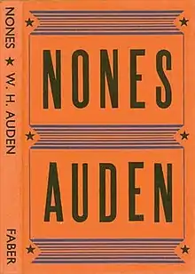 Nones is a book of poems by W. H. Auden published in 1951 by Faber & Faber. The book contains Auden's shorter poems written between 1946 and 1950, including "In Praise of Limestone", "Prime", "Nones," "Memorial for the City", "Precious Five", and "A Walk After Dark".