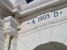 On the ground floor there is an entrance door made of cedar set with sidelights and fanlight,[2] with an etching on the door glass saying Olim Periculum Nunc Salus, Latin for "Once Perilous, Now Safe".[6] Above the door is the writing "•A1903D•", stating the year of official lighting. There is also a "ghost door" on the outside which was planned but never completed.[3]