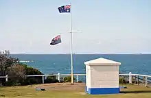 Another structure at the complex is a small signal house, which was constructed as a flag house for the timber flagstaff, both constructed with the original structures in 1903. The flag house was constructed to match the lighthouse, from precast concrete blocks, rendered walls, with the same plinth and deep ashlar coursing. The roof is made of concrete in a shallow hipped form, in contrast to the concrete dome proposed in the original drawings.[2] The flag locker now houses maritime signal flags.[3] The timber flagstaff was removed at an unknown date, and what remains of it are a concrete and steel base, a concrete apron, and four concrete and iron anchor points.[2]