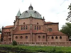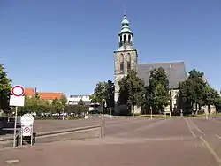 At present, two buildings characterize Nordhorn's skyline. The Alte Kirche on the marketplace, built out of Bentheim sandstone in the 15th century and the Augustinuskirche, built in 1913 on the former castle's lands, can both be seen from afar. The inner town, today as in days of yore an island around which flows the Vechte, is now a pedestrian precinct.