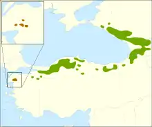 | Natural range of A. nordmanniana. Distribution of subspecies A. n. nordmanniana and A. n. bornmuelleriana is in green, and that of A. n. equi-trojani is in brown. | |