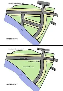 In March 1792 a solicitor named Richard Bowsher took a lease on 5 acres (20,000 m2) of land next to the river Avon at what was then the western edge of the city of Bath.[6] The lease stipulated houses of similar style and quality to those being erected in the nearby New King Street should be built on the land.[6] As with other Bath developers, Bowsher's sub-leased plots of ground to craftsmen, on the condition that they would build houses on them, which would subsequently be let out to wealthy families. Several streets were planned with over 100 houses, the centrepiece being a crescent called Norfolk Place (later changed to Norfolk Crescent[7]). The architect John Palmer was engaged to designed a facade for the buildings.