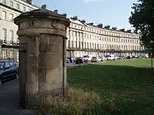 There is a green area in front of the crescent that was originally a formal garden for the residents, surrounded by railings. A small circular building in the corner of the gardens is the old watchman's hut, and is also Grade II* listed.[2][5]