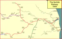 The GER owned two main lines between London and Norwich, and the Norwich to Yarmouth and Norwich to Lowestoft lines of the Norfolk Railway became branch lines of the GER; the same was true of the Dereham branch.[4]