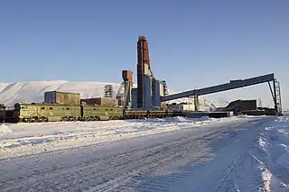 The railway is in northern Krasnoyarsk Krai, southern Taimyr Peninsula and connects the mining towns Talnakh, Norilsk and Kayerkan with the port Dudinka on the Yenisei. The railway line has a 1,520 mm (4 ft 11+27⁄32 in) Russian gauge, and was partially constructed by the prisoners of Norillag. Originally, it was 1,000 mm (3 ft 3+3⁄8 in) narrow gauge, 114 km long, and built in 1936. Later, in 1953, it was rebuilt to Russian broad gauge and expanded to 231 km of track. The railway is owned by the Norilsk Nickel mining company and does not belong to Russian Railways.