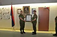 A Student on the Forward Observation Officer Course is presented with the Norman Buchcanan Award through distinguishing himself as the top Candidate. A portrait of Norman Buchanan along with reproduction medals and history are displayed in the background.