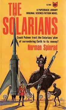 The Solarians (1966), was Spinrad's first published novel. Unlike Spinrad's controversial later work, this novel is a mainstream space opera featuring space battles, faster-than-light spacedrives, and an alien enemy, the Duglaari. The plot of the novel concerns a fleet commander named Palmer who makes contact with a race called the Solarians, who emerge from isolation to help humanity in its long war against the Duglaari.