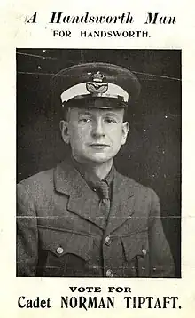 At the 1918 UK general election, Tiptaft stood in Birmingham Handsworth. He was an independent candidate, standing with backing of the local branch of the National Federation of Discharged and Demobilized Sailors and Soldiers. He took second place with, 22.1% of the vote. He was elected to the city council in 1919, and by the 1922 UK general election, he was the leader of the Progressive group on the council. He stood again in Handsworth and, facing a single opponent, he increased his vote share to 40.4%.[3][4]