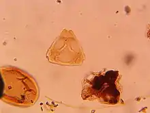 Normapolles is characterized by a triangular amb and an internally complex tricolpate pore structure with deep pore canals[3] “oblate, mostly triporate or brevitricolp(or)ate pollen having complex, commonly protruding apertures and typically a triangular amb, although some are more or less circular in polar view.”[2] Over 160 genera have been described as part of the Normapolles complex.[2] Normapolles grains have been found inside fossilized flowers of the walnut family (Juglandaceae).[4]