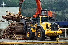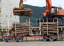 Lumber is hauled by train from Formofoss Lumber Terminal in Grong twice per week, one weekly train arrives from Jämtland via the Meråker Line, and there is a weekly train from Koppang Lumber Terminal on the Røros Line.[76] The mill has a branch line from the Nordland Line just south of Skogn Station, branching off at 75.44 kilometers (46.88 mi) from Trondheim Central Station. The branch is 2.8 kilometers (1.7 mi) long and runs through a loop at Fiborgtangen. There is a 335 meters (1,099 ft) tunnel on the branch.[80]