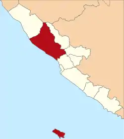 North Bengkulu is a regency (Indonesian: kabupaten) of Bengkulu Province, Indonesia, on the island of Sumatra. It originally covered much of the northern part of Bengkulu Province, but on 25 February 2003 the most northwesterly districts were split off to form a separate Mukomuko Regency (Kabupaten Mukumuko), and on 24 June 2008 the most southeastern districts were likewise split off to create a new Central Bengkulu Regency (Kabupaten Bengkulu Tengah). The residual regency now covers an area of 4,424.59 km2, and it had a population of 257,675 at the 2010 Census[2] and 296,523 at the 2020 Census;[3] the official estimate as at mid 2022 was 302,833 (comprising 154,923 males and 147,910 females).[1] The administrative centre is at the town of Arga Makmur.