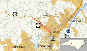 North Carolina Highway 153 (NC 153) is a 2.9-mile-long (4.7 km) primary state highway in the U.S. state of North Carolina. The highway serves as a spur of NC 152 into Landis.