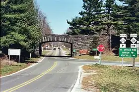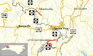 Prior to 1961, the road that connected Little Switzerland was authorized in 1913 to be a toll road, operated and maintained by the Carolina, Clinchfield, and Ohio Railroad. Called Etchoe (pronounced Et-cho) Pass Road, it went from Gillespie Gap to Little Switzerland along the ridge line; toll booths were constructed at Lynn Gap. In 1921, NC 19 was established along Etchoe Pass Road, which by that time was toll-free and continued to Woodlawn.[7] However, it was not without controversy because the nearby Cox Creek route was identified to be shorter, though steeper. The longer route won out, though partly because several state lawmakers had vested interest in the area, and the Cox Creek route was temporarily abandoned. In 1934, NC 19 was replaced by NC 26 in the area; justification was to avoid confusion with US 19.[8] By the early 1940s, the Cox Creek route had reemerged as a new paved road, known locally as "the shortcut." By 1947, NC 26 was rerouted along Cox Creek route and the Etchoe Pass Road became NC 26A.[9][10][11]