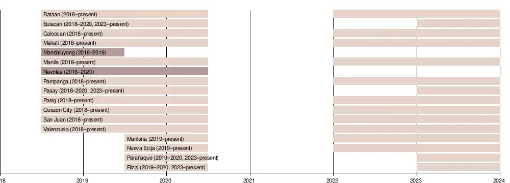 Both divisions were formed as a result of the league's national expansion in the 2018–19 season.[1] The most recent realignment occurred in the 2023 season. In that season, three returning teams in the Bulacan Kuyas, Parañaque Patriots, and Pasay Voyagers were allocated to the North Division while the Rizal Golden Coolers moved from the South Division.