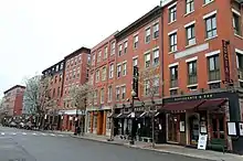 In the first half of the 19th century, the North End experienced a significant amount of commercial development. This activity was concentrated on Commercial, Fulton, and Lewis Streets. During this time the neighborhood also developed a red-light district, known as the Black Sea.[2] By the late 1840s, living conditions in the crowded North End were among the worst in the city.[4][5] Successive waves of immigrants came to Boston and settled in the neighborhood, beginning with the Irish and continuing with Eastern European Jews and Italians.[6] Boston as a whole was prosperous, however, and the wealthy residents of the North End moved to newer, more fashionable neighborhoods such as Beacon Hill.[4]