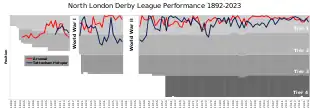Another notable match was in 1898 played at the Spurs ground at Northumberland Park. The match with the then Woolwich Arsenal was attended by a record crowd of 15,000, and the refreshment stand collapsed when spectators climbed up onto its roof in the overcrowded ground, resulting in some injuries and prompting Spurs to start looking for a new ground. The next year the club moved a short distance to what would become known as the White Hart Lane ground.[13] The first League match between the clubs was in the First Division, on 4 December 1909; Arsenal won 1–0.[14]