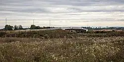 The three-span bridge is 150 metres (490 ft) long (the entire link road stretches for 900 metres (3,000 ft)), and is 12 metres (39 ft) above ground level, with 25-metre (82 ft) deep piles.[14][15] The steel beams of the bridge are 100 metres (330 ft) long and weigh 350 tonnes (390 tons) each.[10] With preparatory works completed, the bridge was lowered into position in September 2021.[16] The cost of the whole link road is £12 million, with £7.6 million being spent on the bridge alone.[3]