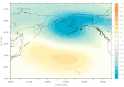 The North Pacific Oscillation (NPO) is a teleconnection pattern first described by Walker and Bliss[1] and characterized by a north–south seesaw in sea-level pressure over the North Pacific Ocean.