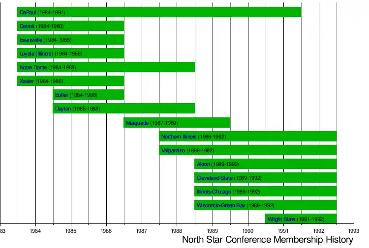 The North Star Conference or NSC was a women's conference in the NCAA. The conference existed from the 1983–84 school year through the 1991–92 school year. Originally announced in 1983, the conference was formed by charter members Butler, Dayton, DePaul, Detroit, Evansville, Loyola (Chicago), Notre Dame, and Xavier.[1] Although the conference was to offer competition in cross country, softball, swimming, tennis, and volleyball, the conference was created primarily as a basketball conference. With the exception of Butler and Dayton, all charter members' women's basketball teams were already competing at the NCAA Division I level; Butler and Dayton upgraded their teams from NCAA Division II and commenced competition in the conference's second season.[1] The conference was effectively absorbed by the Mid-Continent Conference (now known as The Summit League), as six of its final seven members moved their women's sports to that organization (the remaining member, Akron, moved all its sports for both sexes to the Mid-American Conference).