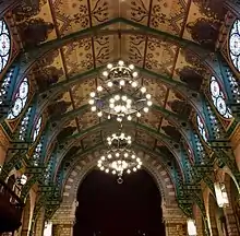 Inside, the great hall displays murals of famous local men, painted by Colin Gill in 1925.[4] It also contains murals of The Muses Contemplating Northampton, painted by Henry Bird in 1949.[9][10] A statue by Sir Francis Chantrey of Spencer Perceval, Member of Parliament for Northampton and the only British Prime Minister to have been assassinated, was originally unveiled in 1817 and is also on display inside.[1][11]