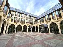 The building was extended to the west to the designs of A W Jeffrey and Matthew Holding in 1892, creating a frontage of 14 bays with arcading on the ground floor and windows above on the first floor.[1] The sculptor R.L. Bolton was commissioned to design 14 statues of monarchs and other famous people which were erected on the front elevation between the windows on the first floor.[5] A modern extension to the east, built to accommodate the expanding office needs of Northampton Borough Council, was completed in 1992.[5]