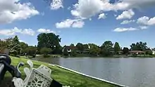 According to the 2020 US gazetteer files, the village has a total area of 13.30 square miles (34.4 km2; 3,440 ha), of which 13.24 square miles (34.3 km2; 3,430 ha) is land, and 0.07 square miles (0.18 km2; 18 ha) (or 0.45%) is water.[1] Situated along the West Fork of the North Branch of the Chicago River, Techny Prairie Park and Fields is the largest park in Northbrook at 113.82 acres and features picnic areas, a sled hill, batting cages, the nine-hole Anetsberger Golf Course[22][23] and Techny Prairie Activity Center, a 44,200 square foot facility housing fitness equipment and studios, an indoor track, pickleball courts, and more.[23] One of the biggest lakes in Northbrook, Lake Shermerville, is located within Wood Oaks Green Park, a 55.9 acre open space with fishing platforms, tennis courts, a playground, bike trail, and more.[24][25] Northbrook lies within the Chicago/Calumet Rivers watershed.[26][27]