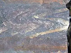 The Northeast Arm Iron Range is part of the Temagami Greenstone Belt which occurs on the southern margin of the Abitibi Subprovince.[1] It consists primarily of a banded iron formation that was deposited in an Algoma type volcanic setting 2.7 billion years ago.[3] The iron and silica mineralization comprising this feature was directly derived from hydrothermal venting associated with major island arc volcanic centres in a Neoarchean ocean.[3][4][5] The lack of hydrothermal sulfur indicates that there was little to no plume fallout from adjacent black smoker style venting. It also raises the possibility that the iron and silica originated from distal rather than proximal hydrothermal sources. Ultramafic lithologies required to generate high-pH fluids are not present, suggesting that chert and iron oxide deposition was unlikely to have been controlled by pH fluctuations of alkaline hydrothermal fluids mixing with seawater.[4] After deposition, the sediments were subsequently compressed, deformed and uplifted to form the present-day banded iron formation. Possible soft-sediment deformation is represented by a series of intricate folds exposed in the Highway 11 cross-section.[1]