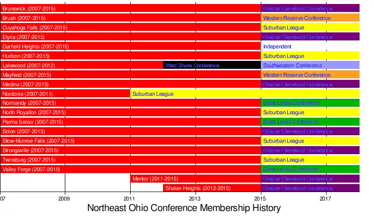 Following the 2010/11 school year, Mentor High School joined after leaving the Lake Erie League, while Nordonia High School left to join the Suburban League. Following the 2011/12 school year, Shaker Heights High School joined after leaving the Lake Erie League, while Lakewood High School left to join the West Shore Conference.[6][7][8][9] Listed below are the current 18 member schools.