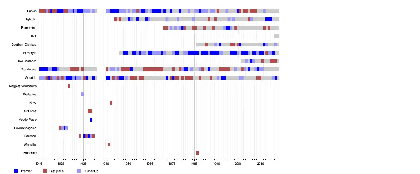 | Nightcliff | 6 | 8 | 1956/57, 1960/61, 1964/65, 2018/19, 2019/20, 2020/21 | 1957/58, 1965/66, 1973/74, 1978/79, 1985/86, 2001/02, 2003/04, 2011/12 |
