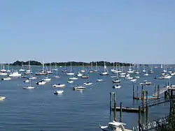 In and around the harbor there are 15 marinas, 13 private clubs with boating facilities, and 5 commercial port facilities. There are more than 1800 berthing spaces and more than 500 harbor mooring locations. About 800 boats may be launched from storage racks at marinas and clubs as well as via the city maintained launching ramp in Veterans Park. More than 2700 commercial vessel trips to and from the harbor occur each year.[3] The main harbor channel is small enough to restrict the size of vessels that could attempt to use it. In 2001 waterborne commerce in the harbor totaled 512,000 short tons (464,000 t). Typical freight included fuel oil, sand, gravel, stone, and shellfish (particularly oysters and lobsters).[2]