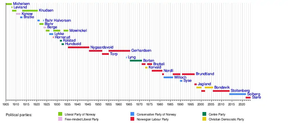 11 March 1905 | 23 October 1907 | 2 years, 226 days | Liberal Party | 1906 | Michelsen V–H–MV |