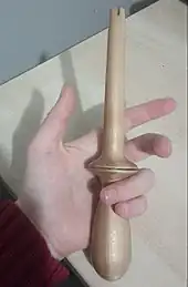 The nostepinne, also known as a nostepinde or nøstepinde, is a tool used in the fiber arts to wind yarn, often yarn that has been hand spun, into a ball for easily knitting, crocheting, or weaving from. In its simplest form, it is a dowel, generally between 10–12 inches (25–30 cm) long and most frequently made of wood, around which yarn can be wound. Decoratively and ornately carved nostepinnes are common.[1] The top of the nostepinne sometimes incorporates a notch or a groove which allows one end of the yarn to be held secure while the rest is wound into a ball.