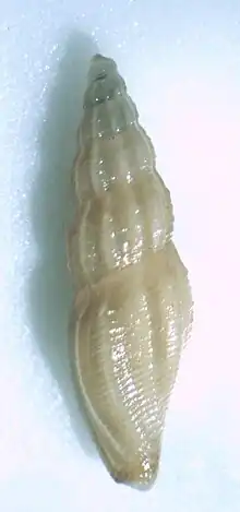 The slender shell is dingy white, with a rather indistinct narrow central brown band on the body whorl. It contains 10-12 slender longitudinal ribs, crossed by close elevated revolving lines. The outer lip is rather sharp on the edge but thickened behind it by a stout rib.[2]