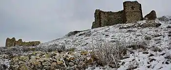 Novo Brdo Fortress (Albanian: Kalaja e Novobërdës, Kalaja e Artanës; Serbian: Тврђава Ново Брдо, Tvrđava Novo Brdo) is a medieval Serbian fortress in Kosovo. Its ruins are located near the town of Novo Brdo, about 40 kilometres (25 mi) east of Pristina. The fortress was built in the late 13th century by king Stephen Uroš II Milutin of Serbia to protect gold, silver, iron and lead mines which were abundant throughout the area. Novo Brdo was famous for its silver. Together with the castles of Prizren, 12 kilometres (7.5 mi) to the southwest, and Prilepac, 13 kilometres (8.1 mi) to the southeast, which guard access roads to the fortress, Novo Brdo helped form a defensive complex overlooking the lucrative mining operations. Novo Brdo was at its height during the Serbian Despotate (1402–1459), when it was the most important mining area and second most important town in Serbia. A significant number of Saxon miners, Albanian Catholics[1] and a large Ragusan merchant colony lived within the town, which was ruled by a vojvoda, but also a governor (kefalija), because it was the seat of an administrative unit of the Despotate.[2]