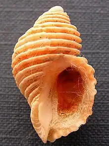 Nucella canaliculata has a robust shell with a strong spire, a short notch to house the siphon, and up to seven whorls. The whorls are demarcated from each other by deep grooves and are sculpted with many low spiral ridges of approximately even size. The surface of the shell is matt; small individuals are often orange while larger ones are grayish or pale brown. The margins of the aperture are often yellow, and the animal's soft parts are protected by a horny operculum. The maximum length of this species is about 4 cm (1.6 in).[2] This dog winkle can be distinguished from the frilled dog winkle (Nucella lamellosa) by the absence of frilled decoration, and from the northern striped dog winkle (Nucella ostrina) by the evenness of the size of the sculpted ridges.[2]