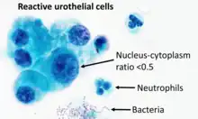 Cytopathology of reactive urothelial changes, Pap stain, showing urothelial cells with enlarged nuclei but a nucleus-cytoplasm ratio of less than 0.5. There are bacteria, as well as an inflammatory response of neutrophils, providing a cause for the changes.