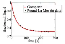 Nucleation occurs in different droplets at different times, hence the fraction is not a simple step function that drops sharply from one to zero at one particular time. The red curve is a fit of a Gompertz function to the data. This is a simplified version of the model Pound and La Mer used to model their data.[14] The model assumes that nucleation occurs due to impurity particles in the liquid tin droplets, and it makes the simplifying assumption that all impurity particles produce nucleation at the same rate. It also assumes that these particles are Poisson distributed among the liquid tin droplets. The fit values are that the nucleation rate due to a single impurity particle is 0.02/s, and the average number of impurity particles per droplet is 1.2. Note that about 30% of the tin droplets never freeze; the data plateau at a fraction of about 0.3. Within the model this is assumed to be because, by chance, these droplets do not have even one impurity particle and so there is no heterogeneous nucleation. Homogeneous nucleation is assumed to be negligible on the timescale of this experiment. The remaining droplets freeze in a stochastic way, at rates 0.02/s if they have one impurity particle, 0.04/s if they have two, and so on.