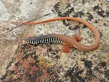 Nucras tessellata, also known as the western sandveld lizard, striped sandveld lizard, tiger lizard, striped sand lizard or banded sand lizard, is a species of lizard in the family Lacertidae.[1][2] It is native to western Southern Africa and is found in western South Africa (Western Cape and Northern Cape provinces), southwestern Botswana, and southern and central Namibia north to Khomas Highland. Its range includes several protected areas, including Tankwa Karoo National Park and ǀAi-ǀAis/Richtersveld Transfrontier Park.[1]