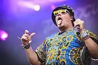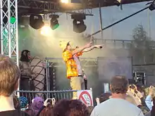 He has gained notoriety for his sexually explicit and misogynistic lyrics and his provocative stage shows (which often include nude women, pyrotechnics, drunk fans and giant inflatable vagina sculptures). His lyrical themes often focus on alcohol, parties, sex, women, pornography, hangover, masturbation, dissing Finnish celebrities and satirizing popculture and phenomena.