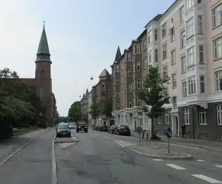 Nyelandsvej is a street in the Frederiksberg district of Copenhagen, Denmark. It runs from Falkoner Allé in the southeast to a roundabout at the north end of Dalgas Boulevard in the northwest. The more urban, eastern part of the street, between Falkoner Allé and Nordre Fasanvej, separates an area with Copenhagen Business School's Solbjerg Campus and Frederiksberg Centret to the south from the Svømmehal Quarter to the north. The western part of the street is passes the multi-purpose venue Keddelhallen and Frederiksberg Hospital before entering an area with Single-family detached homes.