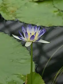 The fragrant flowers extend up to 30 cm above the water surface. The green sepals with blue margins towards the acute apex are 3.5–6.5 cm long, and 0.5–2.5 cm wide. The 15-30 white to blue, lanceolate petals are 3–6 cm long, and 1.3–2 cm wide. The androecium consists of 75–250 yellow stamens. The gynoecium consists of 16–30 carpels. The globose, 1.5–3 cm long, and 1.5–2.5 cm wide fruit bears elongated, 2.1–2.5 mm long, and 1.8–1.9 mm wide seeds with 0.03–0.06 mm long trichomes, and verrucose projections.[2]