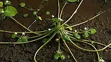 Nymphoides indica spreads by rhizomes, forming clusters of leaves, with clustered white flowers about 1 cm across. The flowers are sometimes described as having five petals,[4] but can have more.