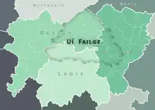 The old territory of Offaly is described by O'Donovan in his Ordnance Survey letters.[2] O'Donovan notes the territory of Ui Failghe, or Ophaley, comprising the baronies of: Geshill, Upper and Lower Philipstown, Warrenstown, and Collestown all in King's County; Ophaley (or Offaley) in County Kildare; Portnahinch and Tinahinch in Queen's County.[2] O'Donovan cites O'Heerin as giving that Offaly was originally subdivided into seven cantreds: Tuath Geisille (Geashill); Hy-Regan (Tinahinch); Clann-Maoilughra (Upper Philipstown and Portnahinch); Clar Colgain (Lower Philipstown); Tuath-Maighe or Tethmoy (Coolestown and Warrenstown); Magh Aoife, or Fearann Uí Mhurcháin, (northern half of the Ophaley); Tuath Leighe (southern half of Ophaley).[2]